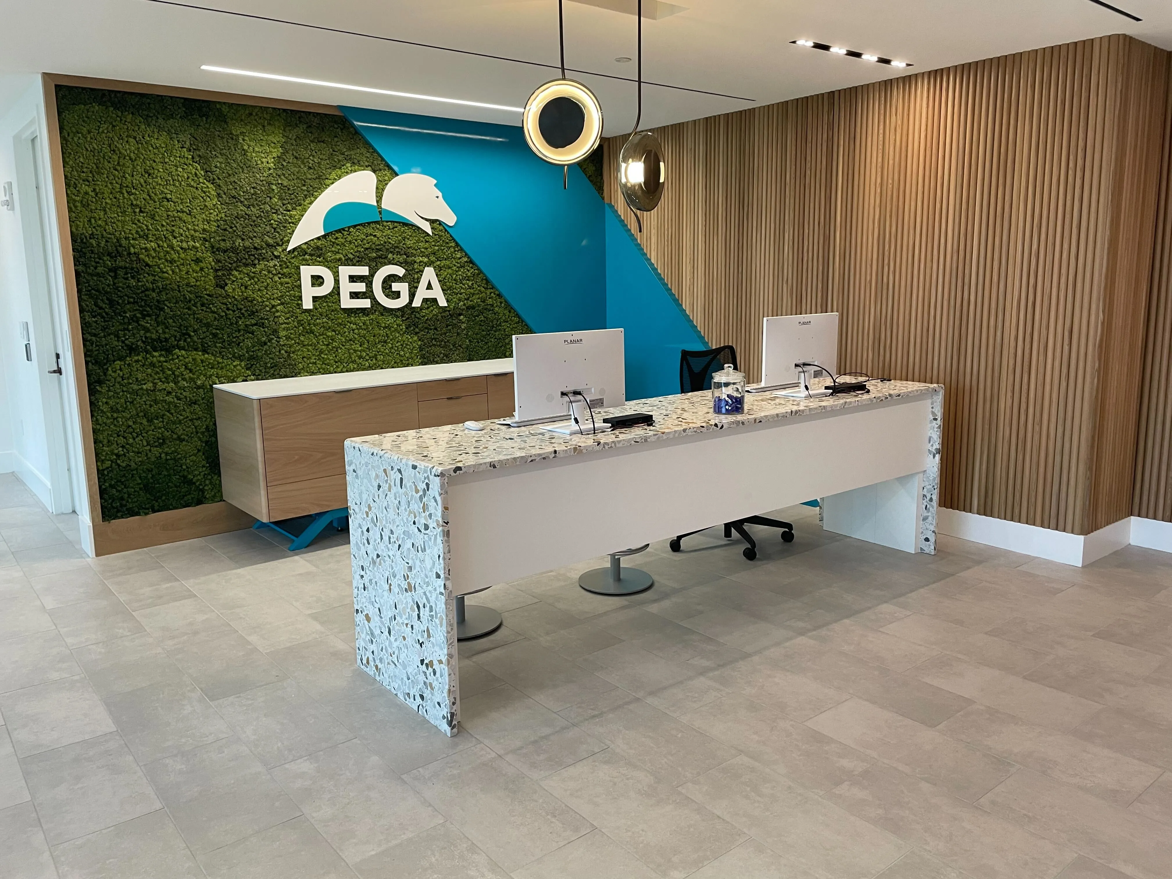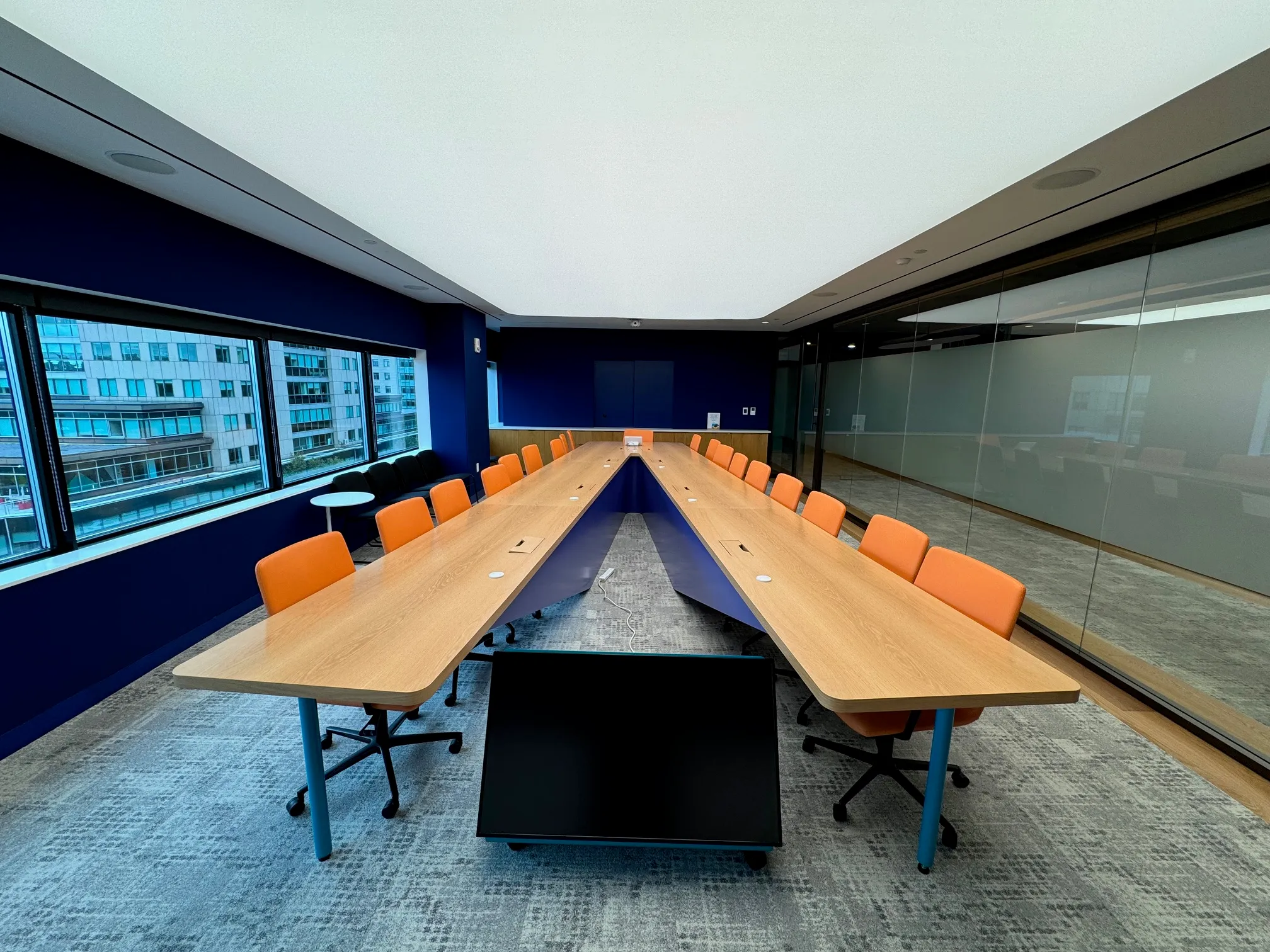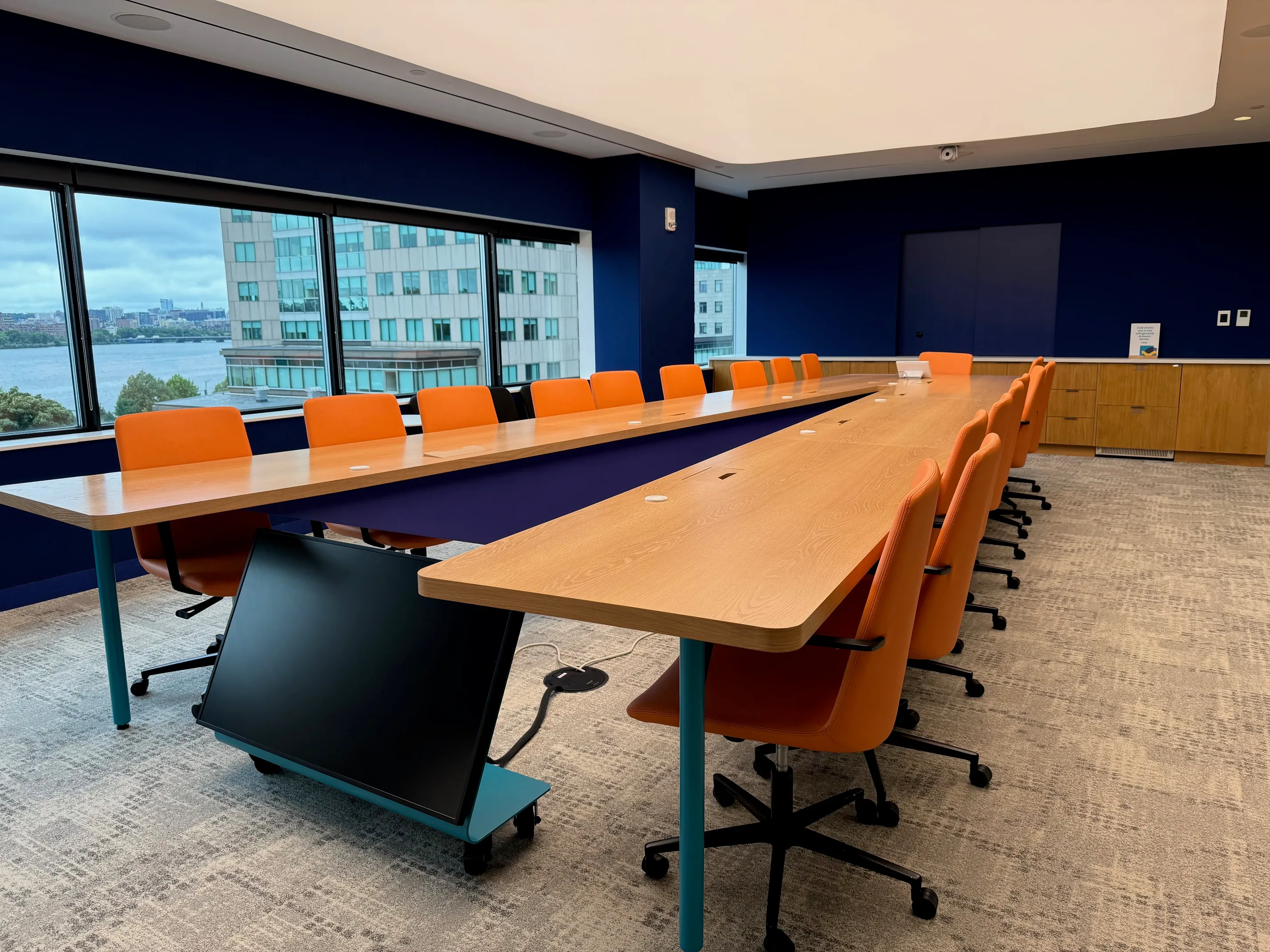 For this Cambridge-based tech firm, we were challenged to design dynamic and impressive specialty furniture and millwork. Two large V-shaped board tables, fully tech-integrated, anchored their executive briefing spaces. Stone and white oak complemented one another in the reception desk and credenza. We also designed and crafted an integrated door portal complete with nestled PTZ cameras for briefings. All in a day’s work.