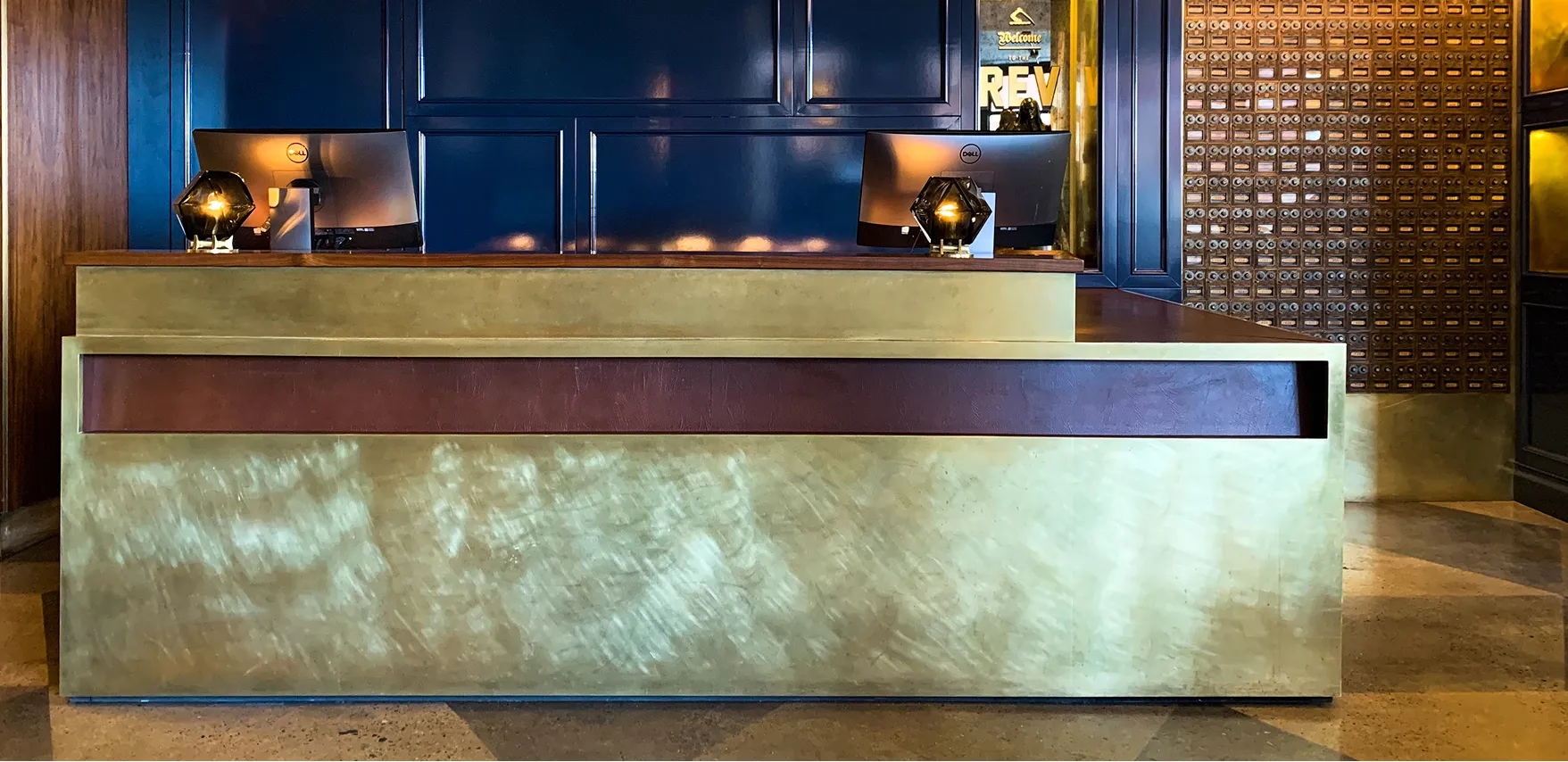 For this historic hotel renovation, we were tapped to fabricate the reception desk, wall cladding, and café with a cast-concrete and brass bar face, as well as repurpose the building's original mailboxes into a feature wall. Leathers and lacquers elevated the finishes in this trendy urban spot.